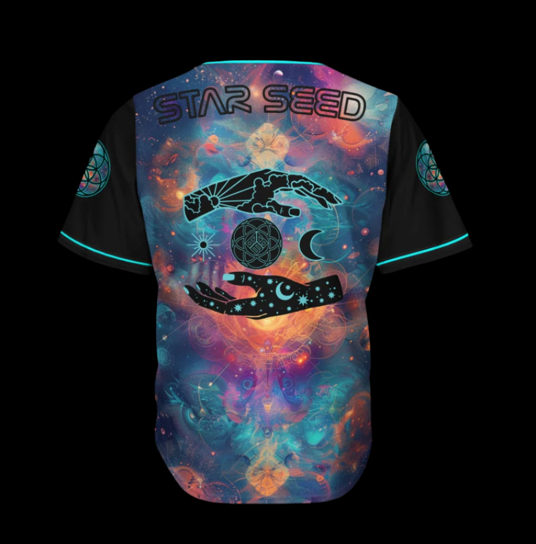 -Back of Baseball jerseys has BBS seed of Life being held by a visual representation of the As Above, So Below concept.