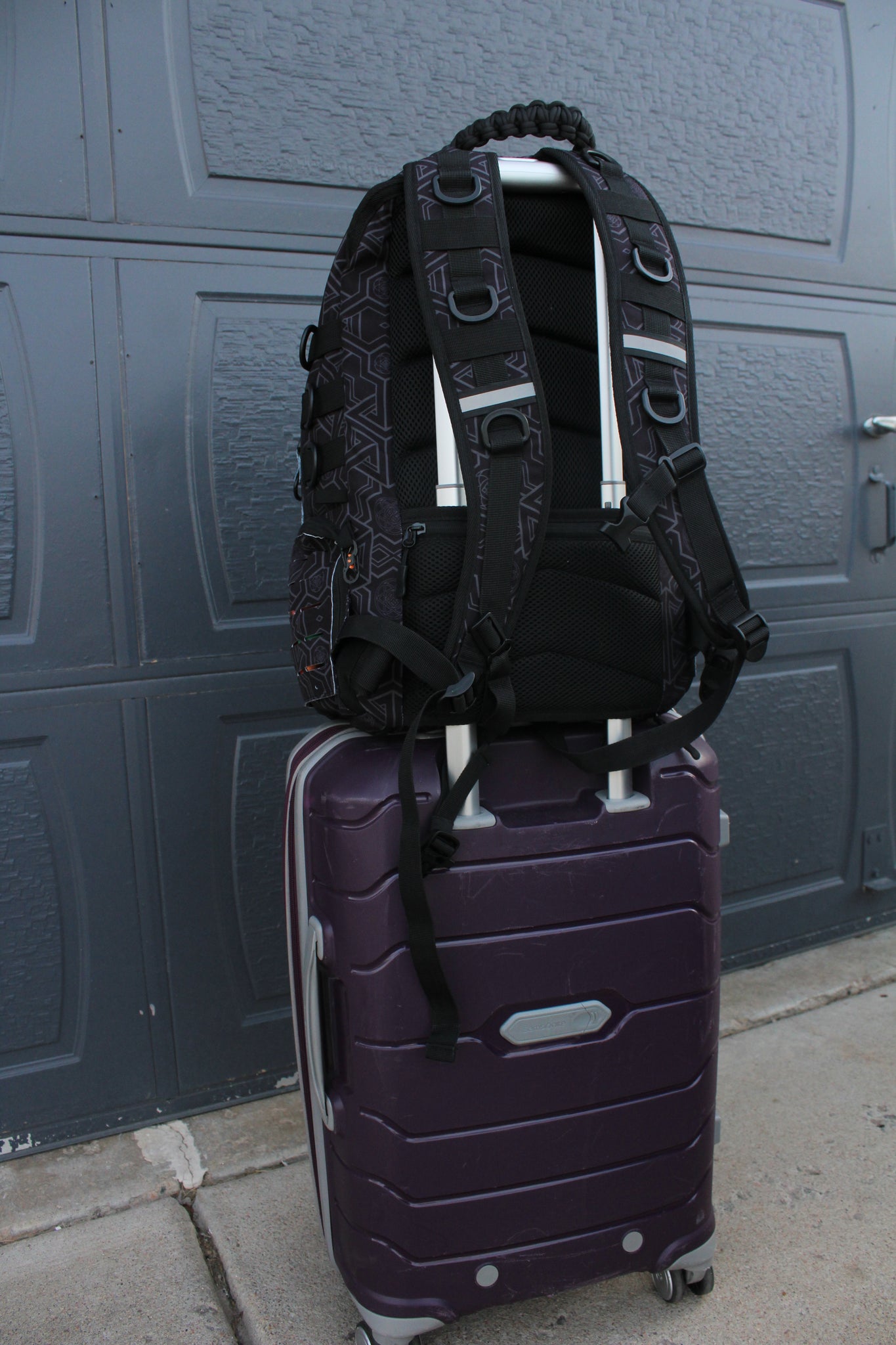 - Padding/Pocket also offer secure slot for luggage handle to easily add your bag to your luggage! (Feature space will be larger in final production than the sample pictured)