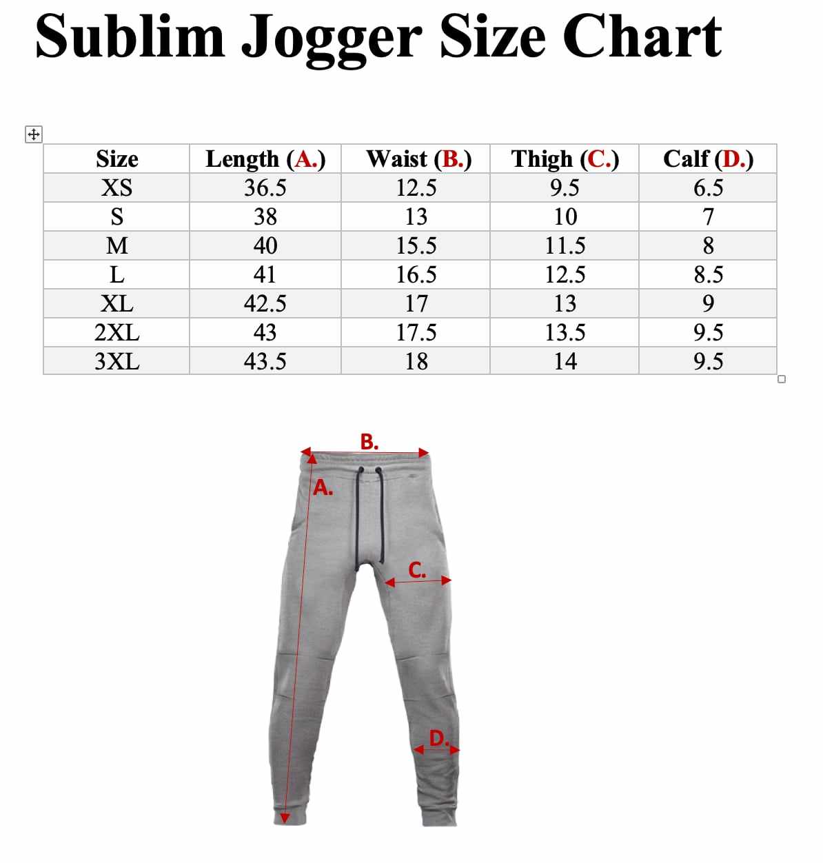 - These are our FULL SUBLIM Joggers. Please see size chart as these fit slightly different. They are a little bigger with less give.